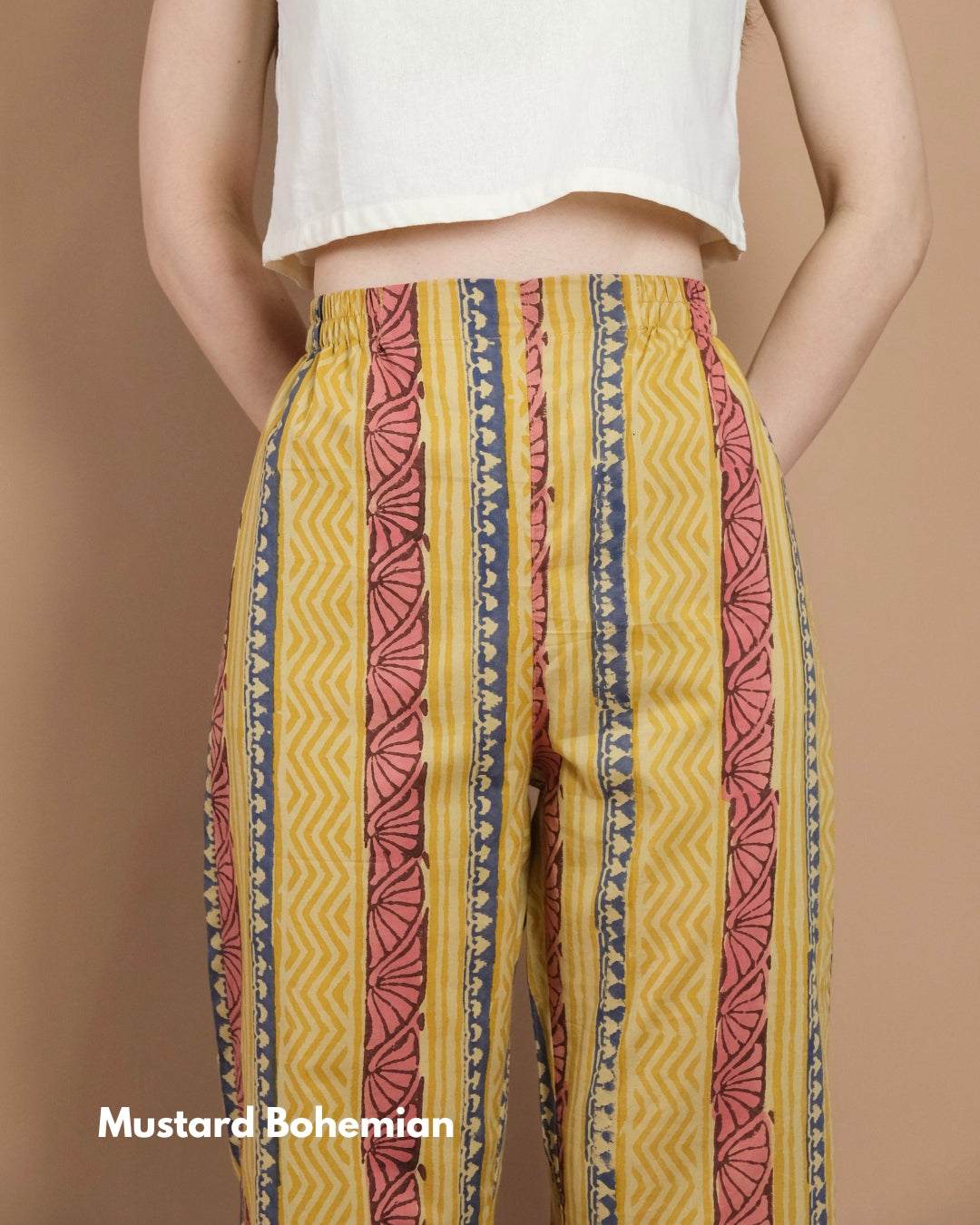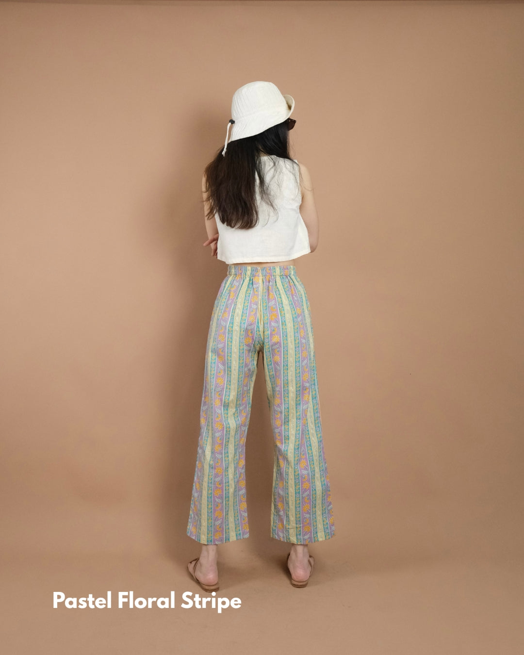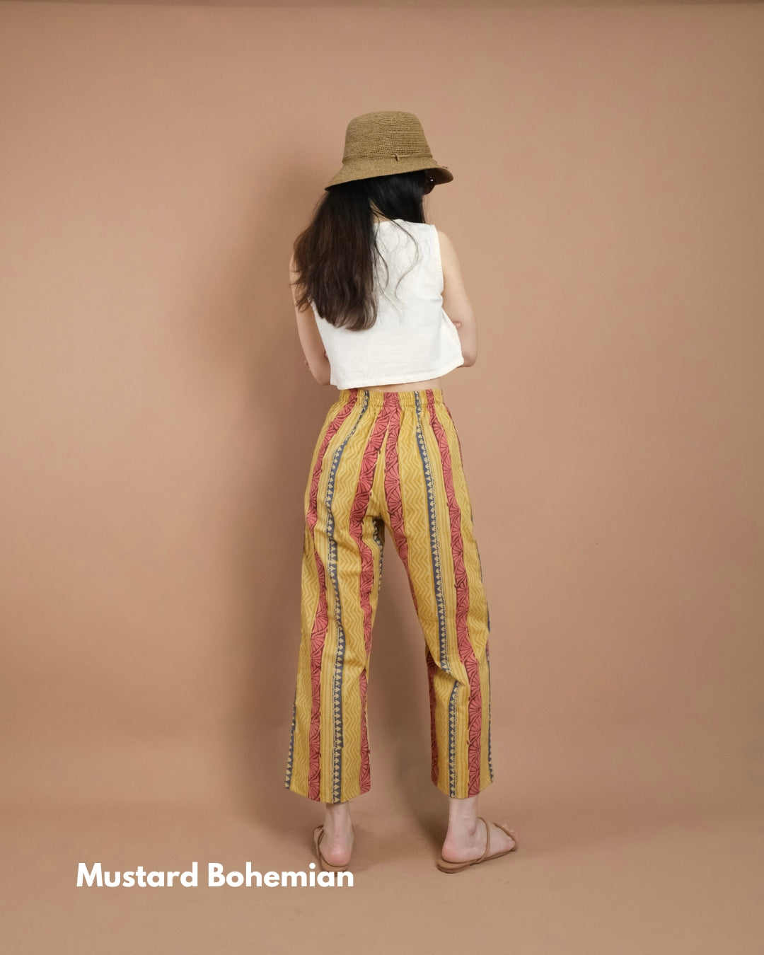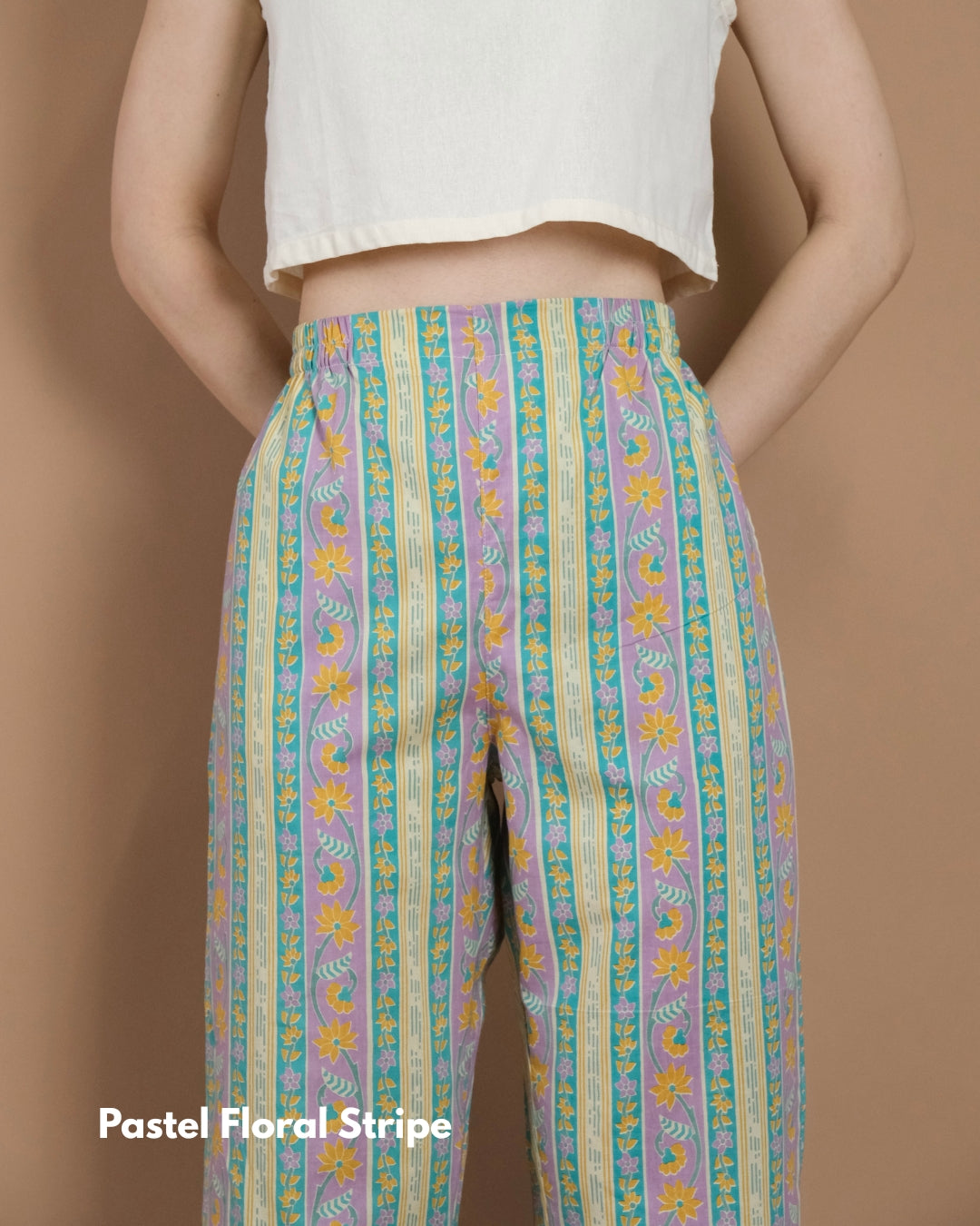 Elastic Waist Pants: smooth, comfy and breathable with Indian cotton on colorful pattern for your lovely sunny vacation day M - waist 24-38” hip 40” Length 37” L - waist 28-42” hip 44” Length 39” waist 29 and above recommend L Model Size 32”/25”/36” H. 173cm Wearing M