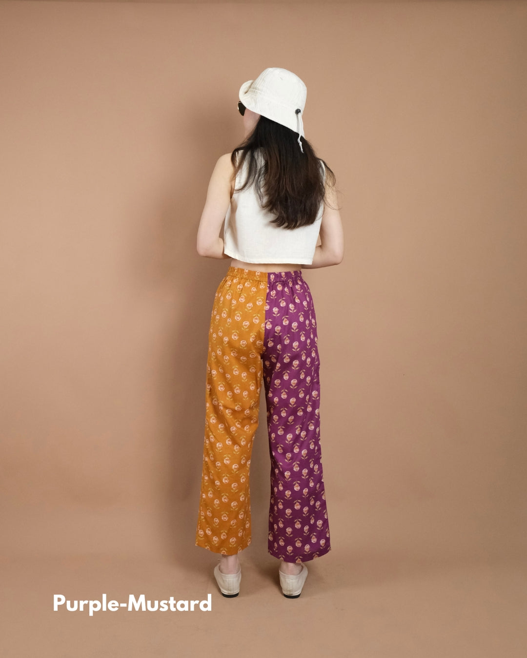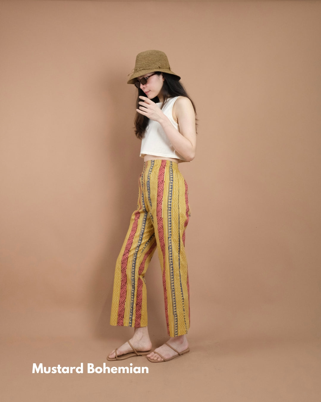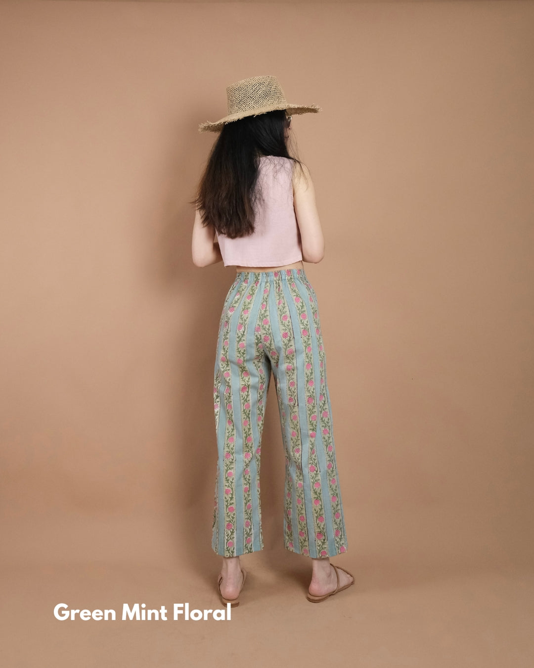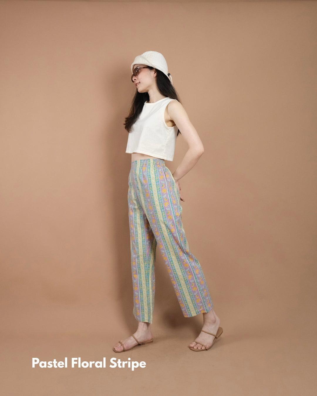 Elastic Waist Pants: smooth, comfy and breathable with Indian cotton on colorful pattern for your lovely sunny vacation day M - waist 24-38” hip 40” Length 37” L - waist 28-42” hip 44” Length 39” waist 29 and above recommend L Model Size 32”/25”/36” H. 173cm Wearing M