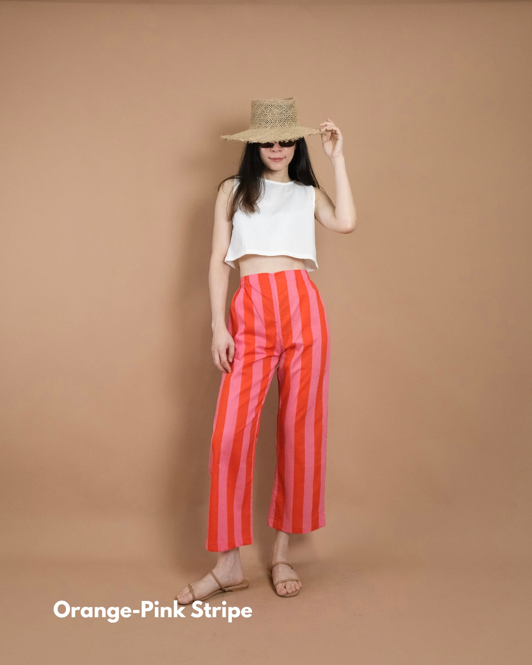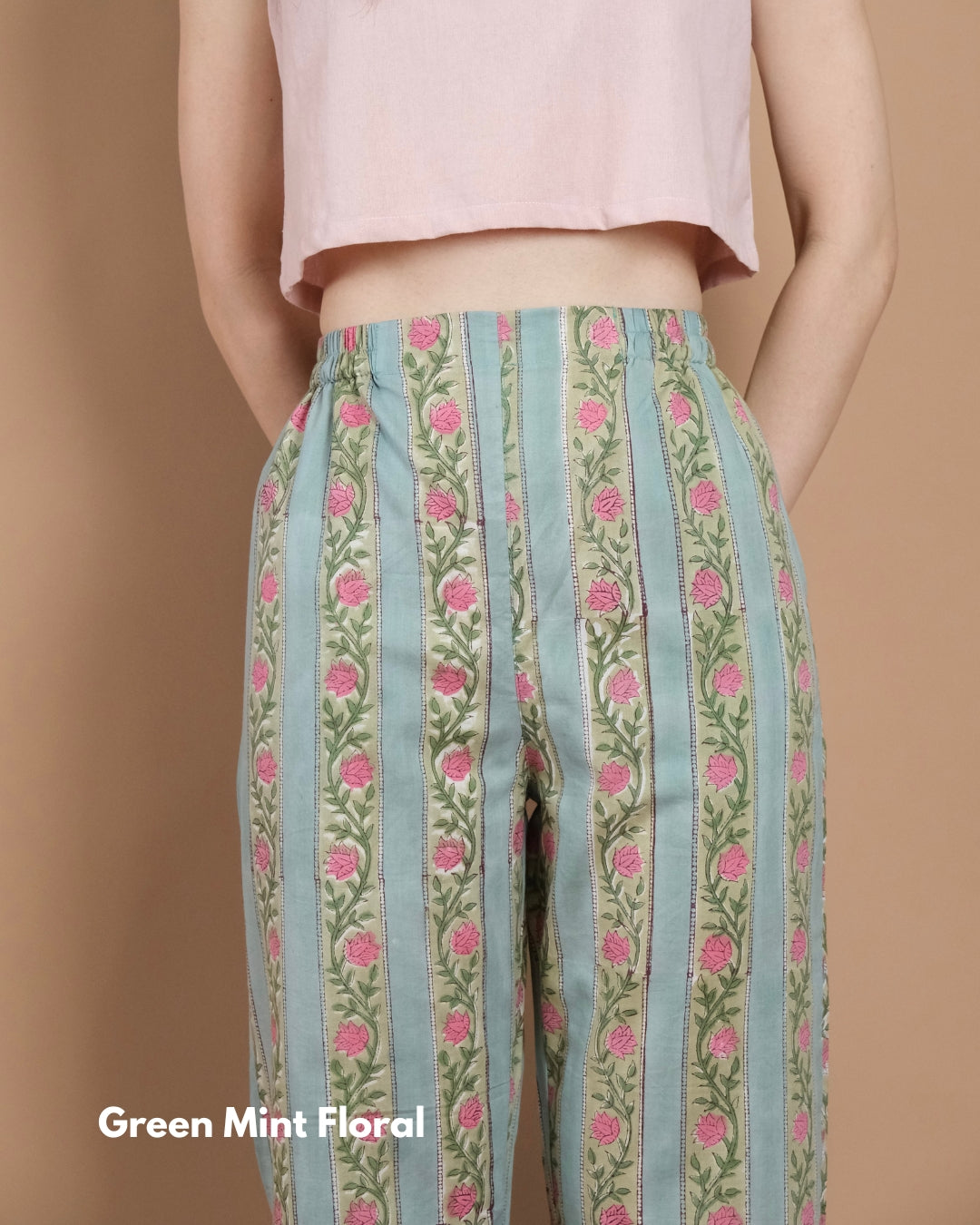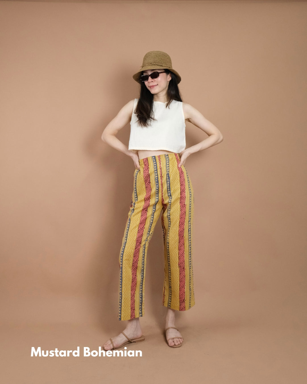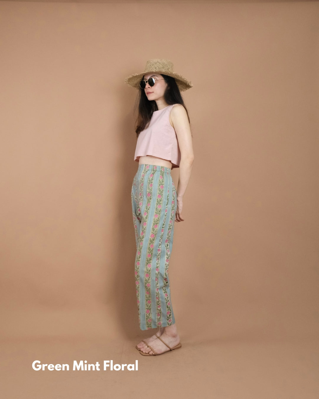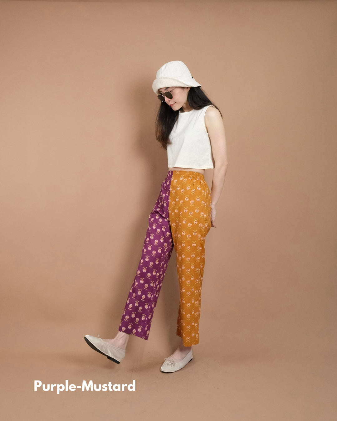 Elastic Waist Pants: smooth, comfy and breathable with Indian cotton on colorful pattern for your lovely sunny vacation day M - waist 24-38” hip 40” Length 37” L - waist 28-42” hip 44” Length 39” waist 29 and above recommend L Model Size 32”/25”/36” H. 173cm Wearing M